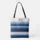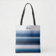 Breite und schmale horizontale Streifen in Blau, Schwarz, Grau und Weiß bilden einen klassischen und klassischen Totbeutel. Personalisieren Sie Ihren Namen in einem großen Farbblock oben.