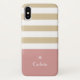 Ein modernes, breites, horizontales Streifen Muster iPhone X Fall in tan und ein dusky rosa. Personalisieren Sie das, indem Sie Ihren Namen unter dem schicken Retro-Logo hinzufügen.