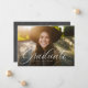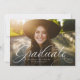 Ein klassischer und eleganter Script-Absolvent in Weiß sitzt am unteren Ende eines horizontalen Fotos. Der benutzerdefinierte Text enthält Platz für den Namen des Absolventen und auch die Schule und das Jahr Details. Der dunkelgraue Backer aus Holzkohle hat ein einfaches Rastermuster, und die Farbe kann durch Klicken auf "Weitere Anpassung" geändert werden. Mit diesem Design verkünden Sie die Leistung Ihres Absolventen an Freunde und Familie!