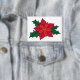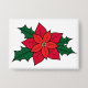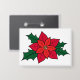 Horizontales rechteckiges Button mit einer weihnachtroten Poinsettia, dunkelgrünen Blätter und einer schwarzen Kontur
