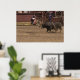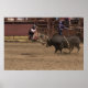 Bullfahrer fliegen mithilfe eines wütenden Bullen in einem Rodeo-Wettbewerb