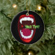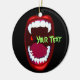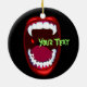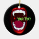 Campy Horror Bild zeigen Plakatstil oder Comic Buchart, Vampirzähne, Reißzähne, scharfe weiße längliche Hunde, ein kräftig roter Tropfen Blut, rote Lippen und gruselig grüner Schriftart. Personalisieren Sie dieses Ornament, indem Sie den Text durch Ihre eigenen Perlen der Weisheit ersetzen. Wenn Sie möchten, können Sie die Funktion zum Anpassen von Größe, Farbe oder Stil des Schriftartes verwenden. Achten Sie darauf, nicht über die Ränder zu gehen - Karo der "Kunstansicht", die das kleine Quadrat mit Punkt zum verlassen Produktbild darstellt, und vergewissern Sie sich, dass sich Ihr Text innerhalb der rot gepunkteten Linie befindet, oder er wird abgeschnitten. Die Hintergrundfarbe dieses Ornaments ist Set in Schwarz, aber Sie können sie ändern, wenn Sie möchten (Anpassen-Bearbeiten-Hintergrund). Diese Dekoration ist perfekt für die Party von Hallowe'en, das Spuk Party des Hauses, die Stilrichtung oder die Gaumenfreuden, die besondere Anlässe, die Horror-Filmabende oder andere ghoulische Ansammlungen, Vampir-Festivals oder was auch immer Ihr Herz begehrt. Kreaturen der Nacht, vereint! Original schlock Horror Filmkunst von M Chaume.