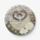 Rustikale Polterabend Papier Platten Vorlagen - Verpaartes Horseshoe Herz mit Rope Bow Knot und Weiße Spitze, Hydrangea Blume String Lights und Burlap Tuch auf dem alten Stall Holz Hintergrund. Ein perfektes Design für Ihren großen Tag. Alle Textstile, Farben, Größen können an Ihre Bedürfnisse angepasst werden!