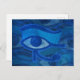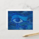 Postkarte mit dem Auge des Horus strukturierte blaue abstrakte Design. Das Horusauge ist in blauen Tönen auf verblassten Horusaugen im Hintergrund zu sehen.