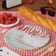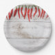 Horizontaler oberer Rand von Paprikaschoten aus biologisch angebautem rotem Chili auf weißem, gewaschenem Holzboden