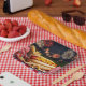 Ein heißer Hund mit dem Wort "AMERICA" in Senf wird auf eine patriotische Platte mit Pommes frites vor einem Hintergrund von pulsierenden Feuerwerken gelegt