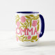 This is a vibrant and floral "Hot Momma" Mother's Day Mug features a wrap-around design with a bold, hand-painted writing, leaves and flowers. This mug is covered in a lush pattern of bright carnations and green foliage.