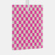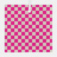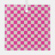A pink and cream checkerboard pattern covers the entire image, creating a vibrant, energetic feel. The repeated squares are evenly arranged.