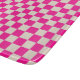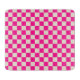 A pink and cream checkerboard pattern covers the entire image, creating a vibrant, energetic feel. The repeated squares are evenly arranged.