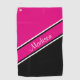 Gehen Sie mit diesem Handtuch zum Golfplatz. Es hat feste, heiß rosa und schwarze Farben mit einem diagonalen Streifen und einem Script-Schriftart. Dies ist ein großartiges Geschenk für Frauen und Mädchen Golfer, die in Golfturnieren oder Freizeit Golf spielen. Passen Sie den Namen in den Personalisierungsoptionen an.