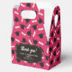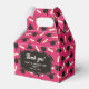 Graduation favor boxes printed with a pink pattern of graduation caps and diplomas with a yellow ribbon. Customize the graduation themed favor boxes with the name of the graduate or the name of the celebration, and with the date.