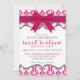 Diese feminine, elegante 16 . Geburtstag Geburtstagsfeier lädt mit einem hellrosa Damast-Muster-Hintergrund, einem hellen rosa Band und einem Bogen-Akzent auf der Oberseite ein. Erhältlich in benutzerdefinierten Farben.