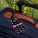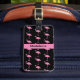 Bright pink cartoon flamingos stand against a black background, creating a luggage tag that is cute and fun! Easy to spot on a luggage cart or carousel.