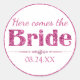 Diese glamourösen Aufkleber-Etiketten zeichnen sich durch ein bachelorettes Design aus. Die Phrase "Here kommt the bride" wird in der Mitte gedruckt, mit "Bride" in einem heißen rosa Glitzer Schriftart. Darunter ist ein luxuriöses Diamantenband gedruckt. Am Ende wird ein Beispiel-Hochzeitstag gedruckt, das Sie personalisieren können, um Ihr eigenes Datum oder einen anderen benutzerdefinierten Text einzufügen.