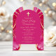 Eine pulsierende und elegante Einladung zur First Holy Communion mit einem beeindruckenden, heißen Rosa und goldenen Age-Design. Diese auf Premium-Acryl gedruckte Einladung verbindet moderne Eleganz mit einer luxuriösen Touch. Die kühnen, heißen rosa Farbtöne, gepaart mit schimmernden goldenen Akzenten, schaffen eine stilvolle und zeitlose Ästhetik und machen sie zur perfekten Wahl für das besondere sakramentale Fest eines jungen Mädchens.