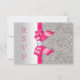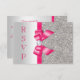 Personalisierte Hochzeit RSVP Flachkarten / Einladungen. Elegante, eigens in Silber und Rosa gehaltene, doppelseitige Antwortkarten mit einem funkelnd, bedruckten Glitzer-Sequenzmuster, niedlich leuchtend rosa bedruckten Vektorbogen und -bändern und hübschen, stilvollen Druckbildern, die Schmuck rauchen und heiß rosa Farbton. Diese eleganten, glamourösen, modischen rosa und silbernen formalen Rsvps sind auf beiden Seiten dekoriert. Schöne, schicke, trendige, moderne, mädchenhaft doppelseitige Karten mit Glitz und Glamour. Bitte beachten Sie: Alle Einladungen auf Zazzle sind flach gedruckt. Ich habe passende Produkte für Hochzeiten in meinem Geschäft. Text, Schriftart und Farben von Schriftart sind alle personalisierbar / personalisierbar, um Ihre Bedürfnisse zu erfüllen. Wenn Sie Hilfe bei der Anpassung Ihres Produkts benötigen, kontaktieren Sie mich bitte über meinen Shop. Bitte beachten Sie:- Alle Einladungen auf Zazzle sind mit flachen gedruckten Bildern versehen.