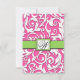 Hot Pink & Lime Green Damask Wedding RSVP Cards - passen zu den Einladungen und mehr, die Sie unten finden. Jede UAWG ist mit einem Blumendach-Damast-Druck in Weiß auf einem heißen rosa Hintergrund versehen. Die Vorderseite und die Rückseite sind mit einer grünen Kalkband mit einem quadratischen Monogramm versehen, das Sie an den Anfang des Bräutigams anpassen können. Diese RSVP-Karten sind Set zu hochwertigen Grundkarten-Bestand; Sie können jedoch den Bestand in Leinen, Filz (Prägung), gerecycelt, und mehrere metallische Schattierungen ändern, wenn Sie möchten, unter der Nummer 2 (Stil, Größe und Papiertyp) unter der orangefarbenen Schaltfläche zum Karton hinzufügen. Eine Liste der Zusatzkosten für einen Kartenbestand wird auch unter dieser Option angezeigt. Jede UAWG enthält einen angepassten, weißen Umschlag. Tipps zum Anpassen Ihrer Hochzeitskarten Dieser Stil ermöglicht Ihnen die Wahl zwischen drei Abendessen. Wenn Sie ein UAWG mit 2 Plätzen oder ein Buffet benötigen, können Sie sich auf der Suche nach den verfügbaren Produkten bedienen. Klicken Sie auf die Schaltfläche Orange anpassen unterhalb der Hochzeit RSVP-Kartendemo oben, um den Schriftart, die Textfarbe oder die Größe zu ändern, was immer Sie bevorzugen. Wenn Sie mit dem Stil, der Textfarbe und den Größen des Schriftartes zufrieden sind, können Sie die Personalize-Funktion rechts neben der Demo verwenden, um die Demo-Informationen einfach auf Ihre persönlichen Hochzeitsdetails zu ändern. Schauen Sie sich einfach die Demo an, nachdem Sie die Details geändert haben (die Demo ändert sich automatisch, nachdem Sie den Text, die Größe oder die Schriftart geändert haben). Die Demo wird Ihnen dann einen Beweis für Ihre Einladung geben, nachdem Sie die Änderungen vorgenommen haben. Klicken Sie auf die Lupe-Taste über der UAWG-Demo, um einen Vollansicht-Beweis zu erhalten. Sie können auch auf jedes Bild (vor und zurück) klicken, um nach den Änderungen aus jeder Seite Karo zu machen. Ein weiterer Tipp ist, auf die Design-Taste über der Demo zu zoomen, um mehr Details zu sehen und eine bessere Vorschau der Farben und Dekoration des Designs zu erhalten. Bitte achten Sie darauf, jede Kartenseite zu Karo, bevor Sie zum Karo in den Warenkorb legen, indem Sie die obigen Tipps befolgen.