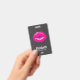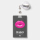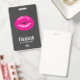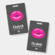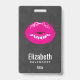 Abzeichen mit personalisiertem Namen mit einer Abbildung mit heißen rosa Lippen. Kühnes und lebendiges Bild. Set auf schwarzem Hintergrund.