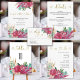 Die einfache und moderne Wedding Invitation Suite besticht durch ein atemberaubendes, kursives Drehbuch in Gold mit Herzverzierungen. Blumenstrauß in Aquarellfarben mit rosa, magentafarbenen, rosa, hellrosa Blume, Grünpflanzen und blühenden Palmenfronten.