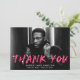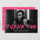 Stilvolle, moderne Abschluss Dankeschön-Karte mit dem waagerechten Foto des Absolventen mit "Danke" in heißen rosa Buchstaben mit weißen Spritzern. Personalisieren Sie die Vorderseite der kreativen Dankeschön-Karte, indem Sie den Namen des Absolventen, die Schule und Abschluss Jahr. Auf der Rückseite des Abschluss-Fotos danke Ihnen Karte Platz für eine getippte oder handgeschriebene Dankeschön-Nachricht und einen warmen Rosa-Weiß-Spritzer Hintergrund.