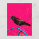 Retro Raven mit einem heißen rosa Hintergrund. Digitales Portrait in blau, schwarz und neonrosa gemalt. Raven auf dem Zweig des Baumes mit dem Himmel im Hintergrund gekrönt. Hot Pink Raven Crow Black Bird