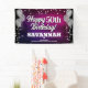 Ein lustiges Bannerzeichen für innen oder außen, mit festlich silberfarbenen Metallballons auf beiden Seiten des Designs mit funkelnd, silbernen Metallkonfetti auf einem reich strukturierten, heißen rosa & lila Hintergrund für Ihr personalisiertes Geburtstagsbanner. Dieses Produkt verdoppelt sich als wunderbarer Meilenstein-Geburtstagssicheres.