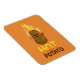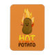 Vergnügen Cartoon braune Kartoffel mit einem großen glücklichen Lächeln, Punkte für Augen und Sticks für Arme. Er ist von heißen Flammen in Gelb und Orange umgeben. Unterhalb ihm in orange und gelb Text ist das Wort HOT und darunter, dass in braunem Text ist das Wort POTATO. Spaß beim Lachen.
