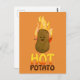 Vergnügen Cartoon braune Kartoffel mit einem großen glücklichen Lächeln, Punkte für Augen und Sticks für Arme. Er ist von heißen Flammen in Gelb und Orange umgeben. Unterhalb ihm in orange und gelb Text ist das Wort HOT und darunter, dass in braunem Text ist das Wort POTATO. Spaß beim Lachen.