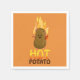 Niedliche braune Kartoffel mit Armaturen und einer großen Happy Fave umgeben von Flammen. Unten in gelben und orangefarbenen Buchstaben ist das Wort heiß, und darunter in braunen Buchstaben das Wort Potato.
