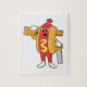 Hotdog als Carpenter mit Säge und Holz Puzzle