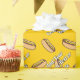 Cartoon-Abbildung von Hotdog. Nahtloses Muster. Benutzerdefinierte Hintergrundfarbe. Eigener Text.