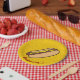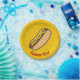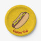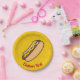 Hotdog-Symbol. Junk Food Kontur Icons Gelbe Muster Hintergrund. Eigener Text.