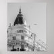 Schwarz-Weiß-Foto der Fassade des Luxushotels Carlton in Cannes an der französischen Riviera. Ein Teil von Alfred Hichcocks Film To Catch a Diief with Grace Kelly wurde hier gedreht. Cannes ist die französische Stadt des Filmfestivals.