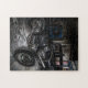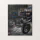 Ein fabelhaftes Foto eines Hotrodwagens in einer Garage, in der im Detail die Autos Motor und Körper gezeigt werden, sowie Garagenwerkzeuge und eine US Flagge-amerikanische Flagge des Fotografen Dave Fletcher