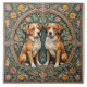 A square decorative tile featuring two dogs in a floral setting, reminiscent of Art Nouveau style. The dogs, positioned side by side, are brown and white with floppy ears and white chests. They have a regal, alert posture. The background is a dense arrangement of stylized leaves and flowers in muted greens, yellows, and pinks, creating a rich, textured backdrop.