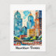 Ein lebendiges Aquarellbild der Skyline von Houston mit berühmten Wolkenkratzern wie dem JPMorgan Chase Turm und dem Wells Fargo Plaza. Das Stadtbild wird von einer breiten Allee gerahmt, die von üppig grünen Bäumen gesäumt ist und ein Gefühl städtischer Grandeur und natürlicher Schönheit schafft. Der Himmel ist klar blau, mit flauschigen weißen Wolken, die das allgemeine Gefühl von Optimismus und Energie noch verstärken.