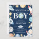 Adorable Baby Boy Dusche Einladung mit einem Astronauten, Raketenschiffen, Planeten & Sternen Set auf einem dunkelblauen Hintergrund. Dreh unseren niedlichen Jungs Einladung zu einem koordinierenden Shooting Star zurück. Besuchen Sie unseren Shop für unsere gesamte Linie inklusive der passenden Verlosung und Buchkarten.