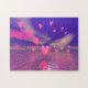 Ein Rätsel mit meinem 3D-Kunstwerk von rosa Herzen, die über reflektierendem Wasser schweben.