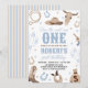 Saddle up for a wild ride! This Western-themed first birthday invitation features rustic desert elements like a cowboy hat, cacti, and horseshoes in soft blue and tan. Perfect for a "How the West Was One" celebration. Easily customize with your son's name and party details for a classic cowboy feel.