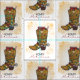 Dieser Cowboy-Stiefel ist für die Ferienzeit mit einer Reihe von Lichtern gekleidet und der Sporn durch eine Glocke ersetzt. Es ist eine festliche und Western Art, den Urlaub zu feiern. Im Hintergrund finden Sie Glitzern und Schneeflocken mit den Worten Howdy Holidays unten. Der Stiefel ist mit einem Geschenk und Bonbons gefüllt. Matching-Produkte verfügbar.
