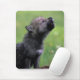 Foto eines bezaubernden schwarzen Wolfs, der im Gras heult.
