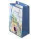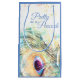 Pfauenfeder in bedrückten, pastellfarbenen Farben lila, rosa, goldfarben und aquamarin. Sagt lila "Hübsch als Pfau".