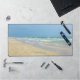 Schönes Strandhaus personalisierte Schreibtischmatte mit herrlicher Meeresfotografie mit einem hübschen Sandpferd stehend am Rande der Ozeanwellen an einem sonnigen Sommertag. Am sandigen Ufer rollen hübsch blaue grüne Wellen, wo Ihr eigener Text in einer hübschen, weißen, kursiven Typografie personalisiert ist. Ein wunderschönes Inselgeschenk mit Zuhause.