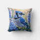 Ein doppelseitiges Kissen mit zwei wunderschönen blauen Jay, die auf einem lila Ast sitzen.