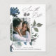 Diese wunderschöne rustikale Aquarellblume ein Foto Hochzeit speichern das Datum Postkarte mit handgeschriebenen Kalligrafieschrift und einem blauen und grauen Boho Bouquet auf einem weißen Hintergrund.