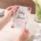 Die schicke botanische Babydusche Vellum Einladung bietet hübsche rosa Blume und rustikale Vegetation auf einem feminin blütenrosa transparenten Hintergrund. Diese schöne Einladung kann auf einer Fotokarte oder einem separat verkauften uAwg überlagert werden.