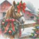 Weihnachtsticker. Ein hübsches, braunes Pferd mit hübschem rotem Bogen hinter einem rustikalen Holzzaun mit festlichem Kreide. Im Hintergrund ist eine alte rustikale rote Scheune.