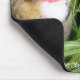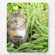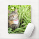 Eine wunderschöne Calico Katze sitzt in einem üppigen Garten und blickt auf den Himmel, auf einem Mousepad gedruckt.