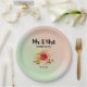 Teller aus Papier mit einem Blumenstrauß der hübschen Wildblume mit Blume in Rot und Gelb, kontrastiert mit rosa und braunen Blätter und Sprigs. Mr. & Mrs. geschrieben in einem trendigen Schriftart. Personalisieren Sie mit Ihrem verheirateten Namen und Ihrem Hochzeitsdatum. Set auf einem Minzgrün und korallenrosa Farbverlauf.