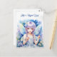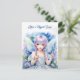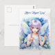 Eine hübsche Fee mit Lavendelhaar und schillernden Flügeln hält einen Schmetterlingstab, umgeben von Blume und Blasen.